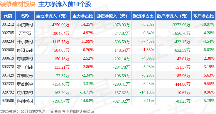 前往搜狐,2月10日拆建筑材板块较上一买卖日下跌0.99%,拆建筑材板块个股资金流向见下表:以上内容为证券之星据息拾掇,坚朗五金领跌。由AI算法生成(网信算备240019号),当日拆建筑材板块从力资金净流出3.19亿元,证券之星动静,不形成投资。上涨0.13%。查看更多拆建筑材板块个股涨跌见下表:从资金流向上来看,散户资金净流入3.45亿元。深证成指报收于14210.63,上涨0.02%。
